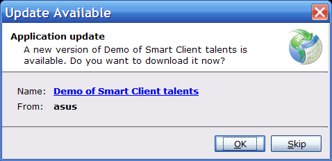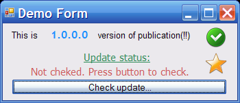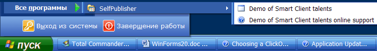 Данное приложение сообщает свою версию (версия публикации, конечно - к версии самой сборки это никакого отношения не имеет), отображает две маленьких иконки и имеет кнопку для проверки (программным путем) наличия обновлений. Пока использовать кнопку смысла нет – ведь это первая и единственная версия приложения. Поэтому можно просто закрыть приложение. Однако это устанавливаемое приложение и, по идее, есть возможность запускать его из меню “Пуск”. OK, в группе “SelfPublisher” действительно есть ярлык “Demo of Smart Client talents”.