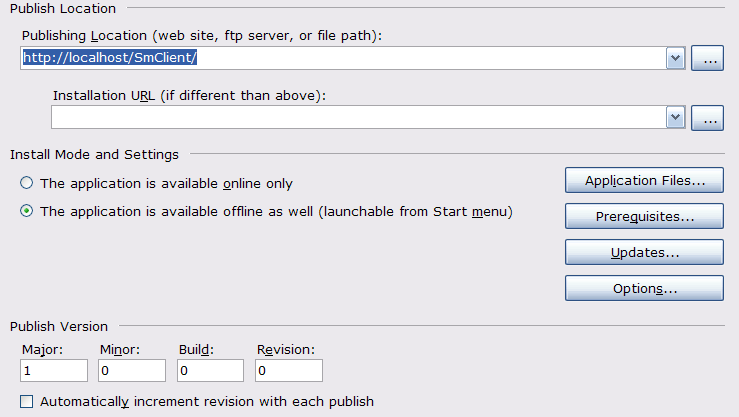 Publishing Location – это размещение, а Installation URL – это, соответственно, адрес инсталляции. И то и другое обсуждалось выше, и, надеюсь, нет необходимости еще раз повторять, почему в данном случае мы вполне можем оставить второе поле пустым. Далее с помощью переключателя Install Mode and Settings выберите, как и договорились, вариант инсталлируемого приложения. В самом низу идет исключительно важное поле Publish Version (версия публикации). Важность его заключается в том, что, во-первых, оно никак не связано с версией самого исполняемого файла (т.е. с версией сборки), и во-вторых, когда в технологии ClickOnce принимается любое решение по вопросу обновления текущей версии приложения, в расчет берется только эта версия – версия публикации. Именно так – версия самой сборки в вопросах обновления не играет решительно никакой роли, движок технологии ClickOnce учитывает только это поле. Наконец, последний флажок может заставить студию увеличивать последний номер (Revision) после каждой удачной публикации. Поскольку в моем примере каждая новая версия приложения – это отдельное решение с отдельными настройками проекта, я эту галочку снимаю. Теперь нажимите первую из четырех кнопок “Application Files…”. Здесь перечислены все файлы решения и их статус публикации. Решение состоит из трех файлов: основной сборки (SmartClient.exe) и двух маленьких картинок, фактически иконок в PNG-формате (ico_1.png, ico_2.png). Обратите внимание, что у первой картинки статус публикации изменен с используемого по умолчанию “Include” на “Data File”. Смысл и влияние данного изменения на процесс обновления (а связан он в первую очередь с ним) будет рассмотрен в свое время. Вторая кнопка “Prerequisites…” позволяет определить, что требуется клиентской машине для успешного запуска приложения, и, в случае отсутствия требуемого, где можно это взять. Подробный разбор всех возможных опций данного окна выходит за рамки данного обзора. Отмечу лишь, что можно довольно скрупулезно настраивать список необходимых компонентов и их местонахождение. Третья кнопка “Updates…” управляет процессом автообновления (а есть еще программный, кодируемый вариант, см. ниже). Самый главный в этом окне - первый флажок. Если его снять, то любой вариант обновления (хоть авто-, хоть программный) становится невозможным. Если он отмечен, то становится возможным (через переключатель) выбор двух принципиально различных подходов к процессу обновления: до старта приложения и после старта. При первом варианте запуск приложения через пункт меню “Пуск” означает совсем даже не запуск самого приложения, а запуск процедуры проверки обновления. Если оно найдено, следует его установка (с разрешения пользователя, разумеется) и запуск уже этой, новой версии. При втором варианте запуск приложения означает именно запуск самого приложения. Но в процессе работы запускается фоновый поток, который и выясняет, появилось новое обновление или нет. В любом случае текущая сессия работает со старой версией приложения. А вот при следующем запуске, если обновление найдено, следует запрос на установку. Понятно, что первый вариант несколько затягивает запуск самого приложения, но позволяет начать работу с новой версией приложения как можно быстрей и оперативнее. При втором варианте “по инерции” продолжается работа на старой версии приложения даже при наличии новой. Правда, второй вариант мож