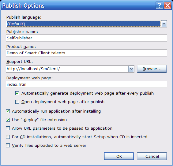 Как же данная идея технически реализована в новой технологии и насколько плотно она интегрирована в VS2005 и в сам Framework? В начале введу понятие “публикация”. Публикация – это набор файлов (*.exe, *.dll, файлы ресурсов и т.д.), необходимых для нормальной работы приложения, и ряд файлов, добавляемых самой инфраструктурой ClickOnce (о них будет сказано ниже). В терминах старого MSI публикация является аналогом выходного *.msi-файла, только здесь файлы не пакуются в один архив. Далее, производится размещение публикации. Размещение – это указание VS места, где должны быть сгенерированы файлы публикации. И, наконец, есть адрес инсталляции. Это адрес странички в интернете, на которую конечный пользователь должен проследовать, и на которой имеется ссылка, инициирующая установку ClickOnce-приложения. Разумеется, размещение и адрес инсталляции могут и совпадать (тогда второе поле в опциях проекта можно оставить пустым). Но это не всегда возможно. Вот пример из практики: при создании этой статьи я использовал известный хостинг narod.ru как место расположения тестовых файлов для их последующей установки на свой компьютер с помощью новой технологии. Если указать размещение как xxx.narod.ru (xxx – учетная запись на “ Народе”) и не заполнять адрес инсталляции, то VS будет пытаться разместить файлы публикации прямо на моей домашней странице. Разумеется у нее ничего не получится – для административного доступа к страничке нужны логин/пароль. Поэтому я указываю размещение как локальную директорию на диске C: а вот уже адрес инсталляции как xxx.narod.ru. Теперь студия генерирует публикацию на локальном диске и не пытается соединиться с интернетом. После окончания этого процесса я могу (например, по FTP) скопировать уже подготовленные файлы по адресу инсталляции и раздать этот адрес своим клиентам.