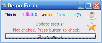Но давайте посмотрим еще на один аспект этого процесса. Закройте решение версии 1.1 и откройте <каталог_проектов>\ClickOnce\ver_1_2\ver_1_2.sln. Здесь уже изменения посущественнее. Помимо вполне очевидного изменения Publish Version до 1.2.0.0, файл-иконка ico_1.png (имя то же, но содержимое другое; в 1.1 это был зеленый кружок с галочкой внутри, а в 1.2 - чашка кофе). Такое изменение позволит убедиться, действительно ли для файлов со статусом “Data File” автоматически распознается изменение их содержимого (согласно документации, ClickOnce должен рассчитывать хэш таких файлов и на этом основании делать вывод об их идентичности или различиях) и будут ли они сгружены на локальный компьютер в этом случае. При неизменном содержимом эти файлы просто копируются из одной версии в другую.