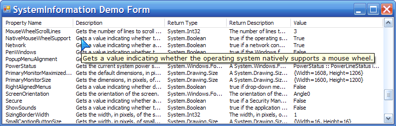 В данный класс добавилось множество свойств, нацеленных, прежде всего, на информирование о внешнем виде всевозможных "рюшечек" в Windows XP. Запустив демо-пример кнопкой "SystemInformation class" в главной форме, можно увидеть все эти новые (а так же и перекочевавшие из версии 1.0/1.1) свойства. Будут показаны: имя свойства, его описание, тип возвращаемого значения, описание возвращаемого значения – и, наконец, само значение. Ничего сногсшибательного, но достаточно занятно и иногда практично. Поскольку описания свойств и возвращаемых ими значений достаточно длинны и, как правило, не вмещаются в отводимые им колонки, вся информация, показываемая в демо-примере, дублируется в виде всплывающих подсказок. Поэтому не спешите судорожно менять размеры колонок, чтобы прочесть полное описание. Лучше просто подождите полсекунды. :) Разумеется, курсор мыши должен быть позиционирован на интересующем вас участке ListView. Никаких проблем с работой этого класса (SystemInformation) я не заметил – все свойства работают и возвращают вполне "вменяемые" значения. Рекомендую к применению. :)