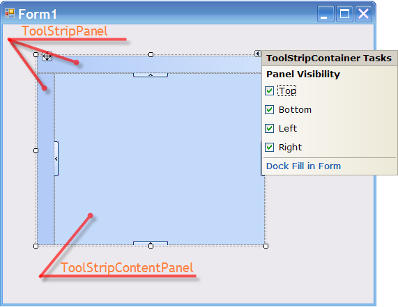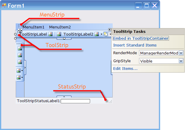 В самом общем виде архитектура новой технологии, а также стиль работы с ней, будут выглядеть так: за основу берется экземпляр класса ToolStripContainer.Это будет контейнер, который примет в себя все меню, инструментальные панели и статусные строки, а также прочие control-ы, не имеющие отношения к рассматриваемой технологии, вроде обычного RichTextBox. В design-time мы просто бросаем экземпляр этого класса на форму. Причем чаще всего мы займем им всю доступную площадь формы: