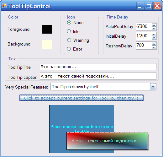 В данном control-е сделан ряд серьезных изменений по сравнению с версией 1.0/1.1. Добавились такие интересные свойства, как ToolTip.BackColor и ToolTip.ForeColor, позволяющие менять цвет фона и текста всплывающей подсказки. ToolTip.ToolTipTitle указывает заголовок подсказки – текст, отображаемый над основным содержимым подсказки жирным шрифтом. Свойство ToolTip.ToolTipIcon позволяет "пририсовать" к подсказке одну из трех маленьких иконок (ошибка/предупреждение/информация), либо указать, что иконка не требуется. Более серьезное свойство, кардинально меняющее внешний вид нашей подсказки – ToolTip.IsBalloon. И наконец, ToolTip.OwnerDraw, установленное в true, позволит рисовать что угодно на всей площади всплывающей подсказки. Это свойство работает в плотной связке с событием ToolTip.Draw, в обработчике которого, собственно, и идет пользовательская отрисовка подсказки.