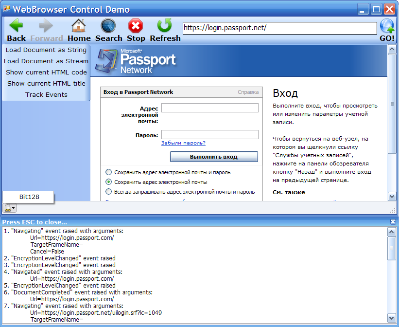 Дело здесь вот в чем. По умолчанию control пытается выглядеть “взрослым” браузером. Поэтому при перетаскивании на него какого-либо документа он осуществляет навигацию к брошенному документу (свойство AllowWebBrowserDrop), реагирует на шорткаты IE (вроде Backspace для возврата на предыдущую страницу, свойство WebBrowserShortcutsEnabled), показывает IE-подобное контекстное меню при щелчке правой кнопкой мыши по странице (свойство IsWebBrowserContextMenuEnabled) и, наконец, выдает предупреждения при обнаружении ошибки скрипта HTML-страницы (свойство ScriptErrorsSuppressed). Соответственно, для такого поведения первые три свойства по умолчанию выставлены в true, а последнее – в false. В общем случае это хорошо и правильно. Но вспомните один из сценариев использования control-а WebBrowser: совместное использование Web- и Windows-control-ов в рамках одной формы. Здесь, конечно, лучше скрыть от пользователя тот факт, что часть control-ов отображаются не самой формой, а браузером. В частности, меню с пунктами “Вперед/Назад/Выделить все…” и т.п. в данном случае будет, мягко говоря, не к месту. Вот как раз для бесшовного сращивания этих двух типов control-ов на одной форме свойствам из указанного пакета рекомендуется присвоить противоположные значения. Теперь немного другой сценарий: при открытии формы с WebBrowser-ом требуется показать пользователю одну и только одну обычную страничку, но воспрепятствовать уходу с нее, в т.ч. и с помощью ссылок, на ней содержащихся. Такое поведение позволит организовать свойство AllowNavigation (тип bool). Изначально оно равно true, и пользователь может свободно перемещаться по ссылкам. Но если поменять его значение на противоположное, то control разрешит загрузку только одной страницы, начальной (Не путайте с домашней!. Начальная страница – любая страница, загружаемая в “чистый” WebBrowser). После этого переместиться с нее будет невозможно. Причем это не удастся сделать как пользователю (путем щелчка по ссылке), так и вам самим (из кода, с использованием метода Navigate)! Имейте этот момент в виду. Следующая пара свойств, CanGoBack и CanGoForward (оба типа bool и доступны только для чтения), сообщает, есть ли в истории посещений предыдущая/последующая страница для возможной навигации. Удобны для включения/выключения доступа к кнопкам Назад/Вперед на инструментальной панели, как и сделано в IE. Сама подобная навигация, напомню, реализуется парой методов GoBack()/GoForward(). Свойство EncryptionLevel также доступно только для чтения, и возвращает одно из значений перечисления WebBrowserEncryptionLevel. Его назначение – сообщить, использует ли текущий документ какой-либо метод шифрования, и если да, то какой именно. Для большинства “нормальных” страниц значением этого свойства будет WebBrowserEncryptionLevel.Insecure, т.е. нешифрованный документ. В прочих случаях будет возвращено одно из оставшихся шести значений для отображения уровня шифрования. В частности, набрав в приведенном ниже примере адрес https://login.passport.com и нажав на иконку закрытого замочка в нижнем левом углу формы (конечно, только после навигации по указанному адресу) можно убедиться, что страница логина службы Microsoft Passport Network использует 128-битное шифрование, что следует из возвращаемого рассматриваемым свойством значения WebBrowserEncryptionLevel.Bit128 (адрес надо набирать именно с префиксом https, набор только login.passport.com приведет на нешифрованный вариант страницы). Данное свойство работает в тесной кооперации с событием Encryptio