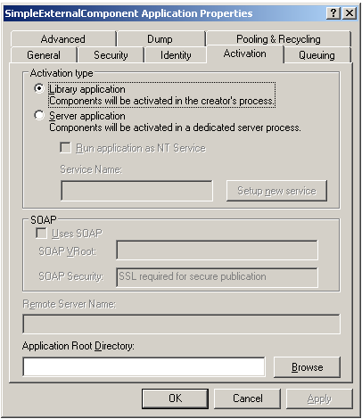 Конфигурирование COM+-приложения осуществляется с помощью атрибутов пространства имен System.EnterpriseServices. Например, приведенный ниже атрибут устанавливает активацию в процессе вызывающего приложения.