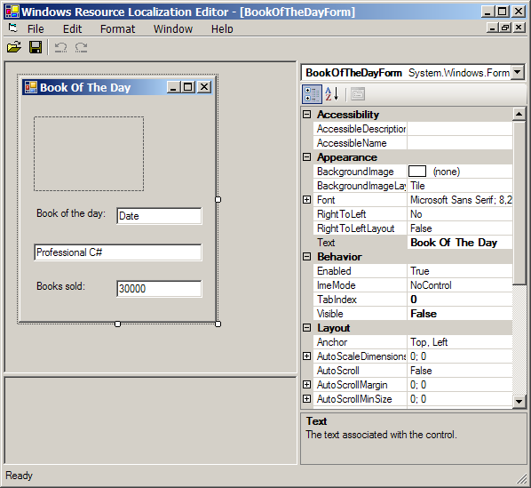 Используя ресурсные файлы, очень легко организовать удаленный перевод приложений. Нет необходимости инсталлировать Visual Studio для перевода ресурсных файлов; достаточно простого редактора XML. Недостатком применения редактора XML является то, что он не дает шансов изменить расположение и размер элементов Windows Forms, если переведенный текст не помещается в исходные границы метки или кнопки. Использование дизайнер Windows Forms для выполнения перевода – более оптимальный выбор