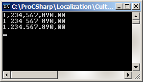 using System; using System.Globalization; using System.Threading; namespace Wrox.ProCSharp.Localization { class Program { static void Main( string[] args ) { int val = 1234567890; // culture of the current thread Console.WriteLine( val.ToString( "N" ) ); // use IFormatProvider Console.WriteLine( val.ToString( "N", new CultureInfo( "fr-FR" ) ) ); // change the culture of the thread Thread.CurrentThread.CurrentCulture = new CultureInfo( "de-DE" ); Console.WriteLine( val.ToString( "N" ) ); } } } |