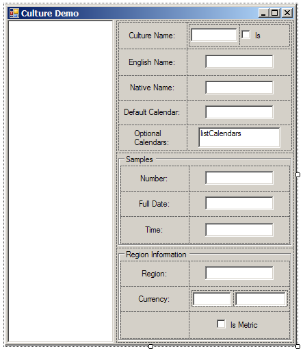 Чтобы увидеть все культуры в действии, используем пример приложения Windows Forms, которое перечисляет все культуры и демонстрирует разные характеристики свойство культуры. На рис. 17-6 показан пользовательский интерфейс приложения в среде Visual Studio 2005 Forms Designer.