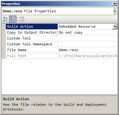 Локализованные версии флагов могут быть добавлены копированием Resource.resx в Resource.de.resx и Resource.fr.resx с заменой имен файлов изображений соответственно на GermanFlag.bmp и FranceFlag.bmp. Поскольку строго типизированный ресурсный класс необходим только с нейтральным ресурсом, свойство CustomTool может быть очищено в ресурсных файлах специфических языков.