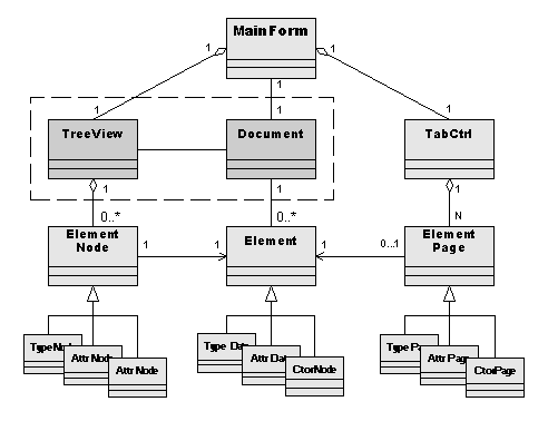 Центральный класс, класс вокруг которого строится вся структура программы - Element. Element - это всё, что имеет свой отдельный значок в дереве - это объект, тип, конструктор, событие... Дерево, в которое собраны элементы, является документом. Для хранения и представления дерева элементов используется TreeView. Конечно, это означает, что архитектура Document/View не соблюдена не вполне, документ слился с одним из своих view (это обозначено пунктирной рамкой на диаграмме). Но зато...
