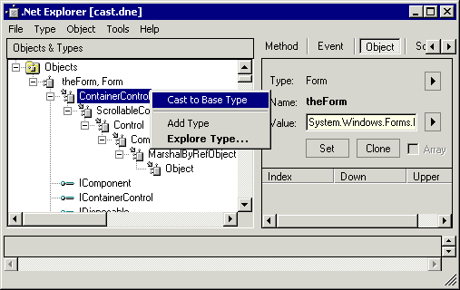 Обратите внимание - для "родных" сборок есть ещё один способ приведения типов. Среди подэлементов объекта в дереве указаны все его базовые типы и все реализованные им интерфейсы. Контекстное меню для этих элементов позволяет произвести приведение типа объекта к базовому типу или к интерфейсу.