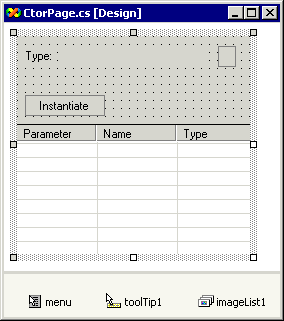 Задача страницы свойств сводится к предоставлению пользователю возможности задать параметры конструктора и к вызову метода элемента - Instantiate(). Давайте посмотрим как с этой задачей справляется CtorPage.