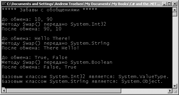 Обратите внимание на то, что обобщенный метод определяется с помощью указания параметра типа, размещаемого после имени метода, но перед списком параметров. Здесь вы заявляете, что метод Swap() может работать с любыми двумя параметрами типа <T>. Просто для информации вы выводите имя типа соответствующего заменителя на консоль с помощью оператора C# typeof(). Теперь рассмотрите следующий метод Main(), в котором происходит обмен между целочисленными и строковыми типами.