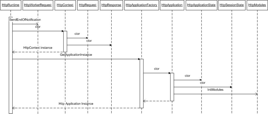 HttpRuntime создает экземпляр HttpContext, который, в свою очередь, инициализирует HttpRequest и HttpResponse. Затем через фабрику HttpApplicationFactory создается новый экземпляр HttpApplication. В него загружается его состояние, то есть объект класса HttpApplicationState. После этого происходит процесс инициализации созданного экземпляра HttpApplication.