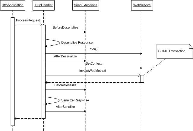 По запросу, посланному пользователем (*.asmx, *.ashx, *.aspx и т.д.), создается фабрика обработчиков (IHttpHandlerFactory). Все фабрики записаны в секции <httpHandlers>. Далее создается фабрика протоколов, используемых при запросе. В случае Web-сервиса этой фабрикой является SoapServerProtocolFactory. С помощью созданного экземпляра ServerProtocolFactory создается объект ServerProtocol, который передается конструктору обработчика. После создания ссылка на обработчик помещается в свойство HttpContext.Handler.