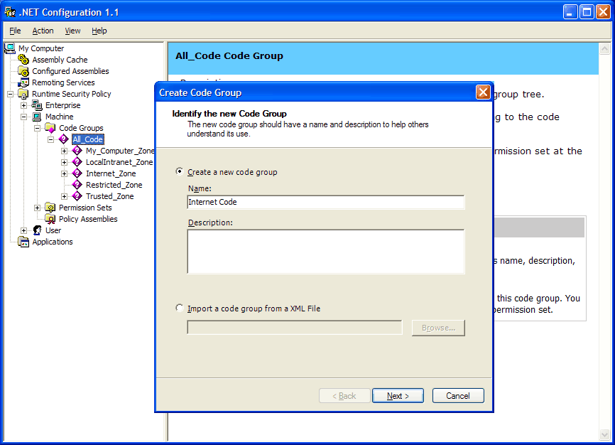 Теперь, используя оснастку (рисунок 3), изменим настройки безопасности. Для этого в ветке Runtime Security Policy\User\Code Groups\All_Code создадим новую группу “Internet Code” и настроим ее.
