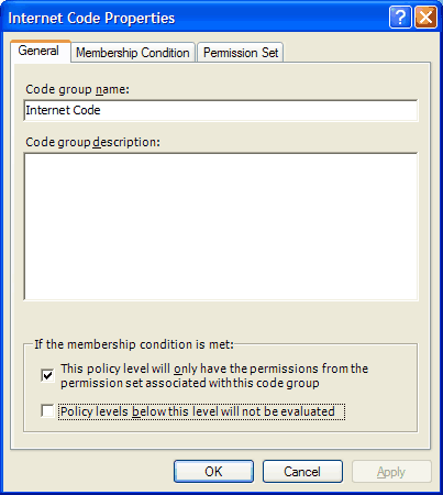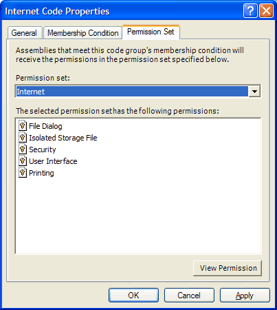 | NetCodeGroup | Поведение этой группы совпадает с поведением UnionCodeGroup с одним отличием – результирующий набор прав содержит динамически сформированный набор полномочий WebPermission. Так, если в Evidence сборки есть Url = http://www.rsdn.ru/application/sample.exe, то приложение получит доступ к http://www.rsdn.ru/* и https://www.rsdn.ru/*. Однако если приложение изначально запустить через HTTPs протокол, то доступа к “небезопасному” ресурсу оно не получит |