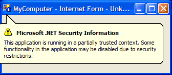 Один из самых простых способов управления политиками безопасности – это через оснастку “Microsoft .NET Framework 1.1 Configuration ”. Рассмотрим простейшее Windows.Forms приложение на котором можно будет увидеть работу политик безопасности в действии. Для этого создадим пустую форму запустив которую в большинстве случаев мы увидим примерно следующее (Рисунок 2)
