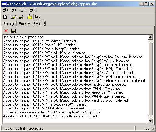 RegExRep.exe -r -SCppStr-2.shr -SCppStr.shr -LTestLog.txt -DC:\TEMP\Test |