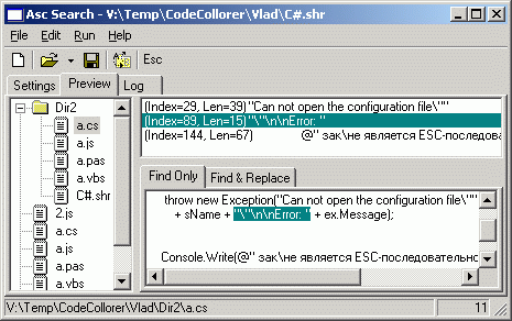 При установке свойства SelectedIndex (как в обработчике события tvFiles_AfterSelect) или при активизации элемента списка пользователем ListBox-е lbFileMatch генерирует событие SelectedIndexChanged. Обработчик этого события выделяет соответствующий фрагмент текста в текстовом окне tbFileBody (производя прокрутку этого окна, так, чтобы выделенный текст стал виден на экране) и заполняет текстовое окно tbReplaceResult значением подстановки (которое получалось бы, если бы замена была произведена):