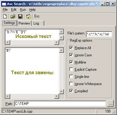 выполняет две пакетные замены в каталоге C:\TEMP\Test. Описание замен берется из файлов CppStr-2.shr и CppStr.shr. Эти файлы должны находиться в каталоге, из которого производится вызов RegExRep.exe. Информация о ходе работы помещается в фойл TestLog.txt.