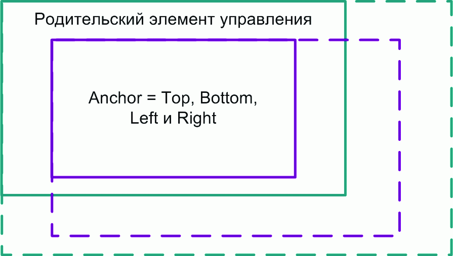 В этой идеологии считается, что каждый элемент управления прикрепляется к родительскому с помощь якорей. Имеется четыре якоря: Top, Bottom, Left, Right. По умолчанию у большинства элементов управления установлены якоря Top и Left. При этом изменение размеров формы никак не воздействует на элементы управления, они просто остаются на месте, не изменяя своих размеров.