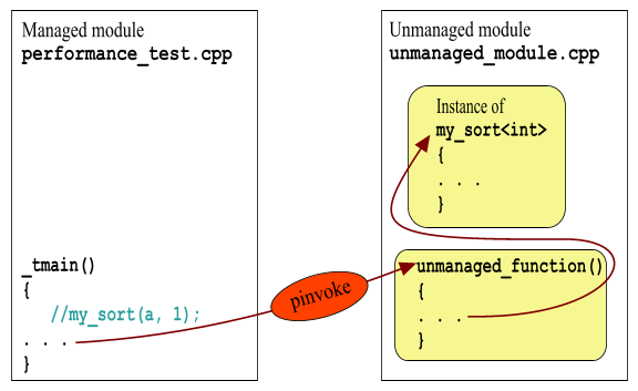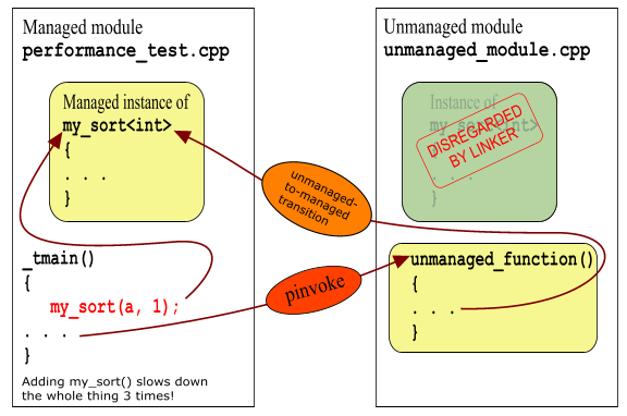 Скомпилируйте, запустите. Увы! Изначальные тормоза вернулись на место :-(. Но что же произошло? Ведь этот один-единственный вызов ничего не делает и ничего меняет, тем более, что он находится за пределами кода, в котором измеряется время. Так вот, все это из-за развертывания шаблонов. Дело в том, что теперь, как в unmanaged_module.obj, так и в performance_test.obj живет по экземпляру кода my_sort<int>. А поскольку нехорошо иметь два экземпляра одного и того же кода в исполняемом модуле, компоновщик должен уметь оставить только один из них – все равно они идентичны. И теперь, когда включено упоминание об использовании my_sort<int> в managed-секции (perfornace_test.cpp), появилось два идентичных экземпляра кода... Идентичных по функциональности, но не по эффективности! А компоновщик предпочитает медленный managed-вариант быстрому и хорошему unmanaged, в результате чего все старания идут насмарку. Вот как это происходит: