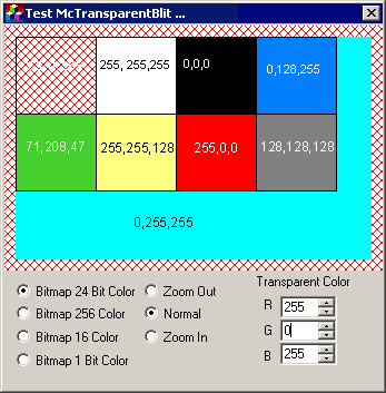 Так получилось, что в моей программе очень часто использовалась функция TransparentBlt. К сожалению, она появилась только в Windows 98 и Windows 2000. Недавно, передо мной был поставлен вопрос о необходимости работы программы в Windows 95 и Windows NT 4.0. Естественно, отказываться от возможностей TransparentBlt мне не хотелось. Так, на свет появилась функция McTransparentBlt, которая по параметрам и основной функциональности совпадает с TransparentBlt. Для тех кто не в курсе, McTransparentBlt копирует изображение c контекста устройства прямоугольной области с учетом прозрачного цвета.