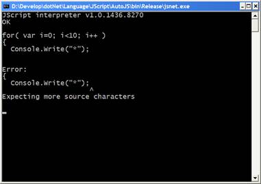 И раз уж сам базовый интерпретатор Microsoft JScript.NET предоставляет расширенную информацию об ошибке, такая информация отображается и моим интерпретатором в удобочитаемом виде. В данном случае, мы видим сообщение, что в последней строке явно не хватает текста.