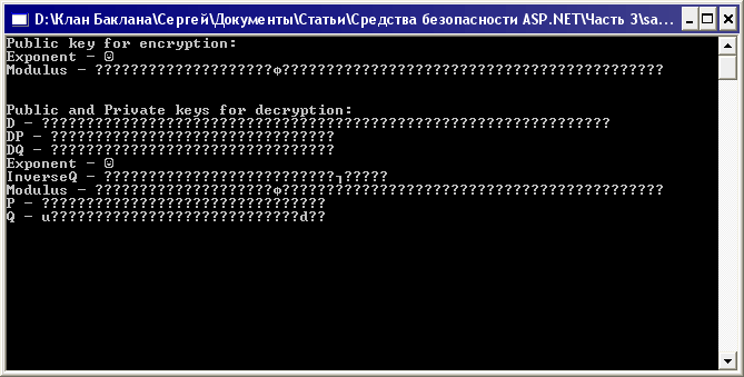 Сначала был создан экземпляр объекта DSACryptoServiceProvider, при этом сгенерировалась пара ключей. После этого были созданы экземпляры объектов DSASignatureFormatter и DSASignatureDeformatter. В качестве атрибута конструкторов передавался объект DSACryptoServiceProvider, содержащий информацию о ключах:
