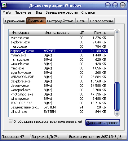 По умолчанию процесс ASP.NET-приложений запускается от имени пользователя ASPNET, в чём вы можете убедиться, открыв Task Manager на закладке Процессы (рисунок 3). |
