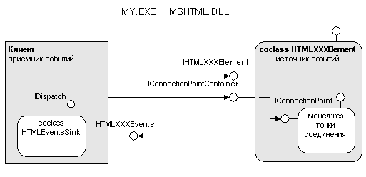 Начиная с IE 4.0, практически каждый элемент объектной модели DHTML поддерживает событийный интерфейс HTMLElementEvents2. Этот интерфейс определяет набор событий, которые могут происходить с html-элементом в процессе работы пользователя со страницей. WebBrowser использует стандартный механизм подключения к подобным событиям - Connection Points (рис. 2).