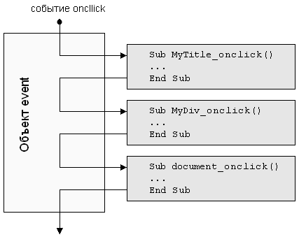 При использовании объектной модели DHTML из скриптов, можно создавать собственные обработчики событий. Для этого нужно создать функцию-обработчик и присвоить ее имя свойству, отвечающему за обработку некоторого события: