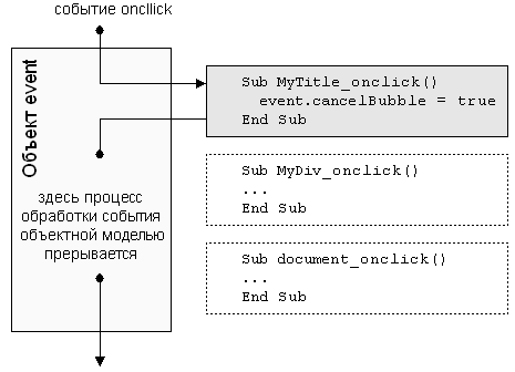 Ранее было показано, как один щелчок мыши послужил поводом сразу для 3-х однотипных событий. Однако иногда хочется самим выбирать путь прохождения события. Свойство cancelBubble позволяет разрушить цепную реакцию возникновения событий. Смысл сказанного проще понять из рисунка 4.