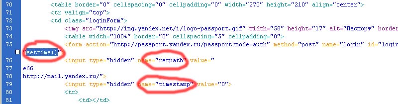 Судя по всему, параметр retpath содержит адрес страницы, на которую мы перейдем после успешной проверки логина и пароля. Параметр timestamp содержит отметку времени. Вообще, важной частью анализа является не только анализ заголовков, но и анализ всего остального трафика, который возвращает сервер (HTML и т.п). Если открыть HTML-код главной страницы Яндекса, то мы увидим, что все передаваемые параметры входят в состав формы «login», которая, собственно, и содержит в себе все передаваемые элементы (см. рис. 1).
