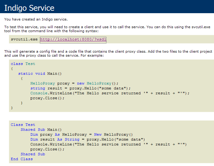 Осталось только воспользоваться полученным кодом. Работать с сервисами Indigo так же просто, как и с веб-сервисами. Единственное отличие, видное сразу – экземпляры прокси-классов необходимо явно уничтожать.