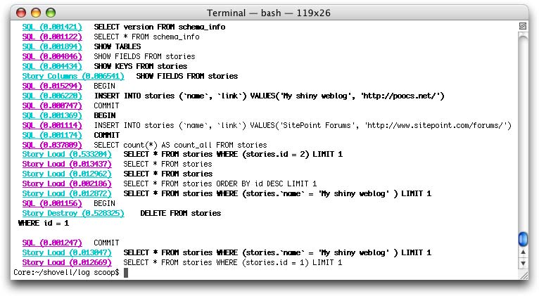 Вкратце мы рассматривали возможности логирования, предоставляемые ActiveRecord, в пятой главе – когда говорили об автоматизации, то есть генерации SQL, неявно выполняемой в Rails.