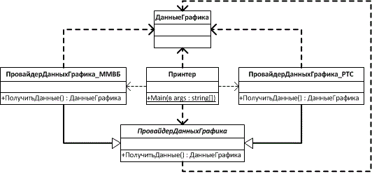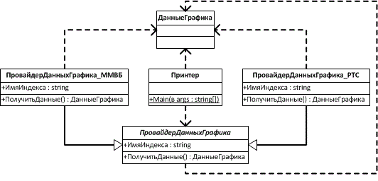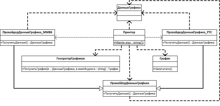 Main(string[] args) { ПровайдерДанныхГрафика провайдерДанныхГрафика; if (args[0] == "ММВБ") провайдерДанныхГрафика = new ПровайдерДанныхГрафика_ММВБ(); if (args[0] == "РТС") провайдерДанныхГрафика = new ПровайдерДанныхГрафика_РТС(); ДанныеГрафика данныеГрафика = провайдерДанныхГрафика.ПолучитьДанные(); ГенераторГрафиков генераторГрафиков = new ГенераторГрафиков(); График график = генераторГрафиков.ПолучитьГрафик(данныеГрафика, args[0]); график.Напечатать(); } |