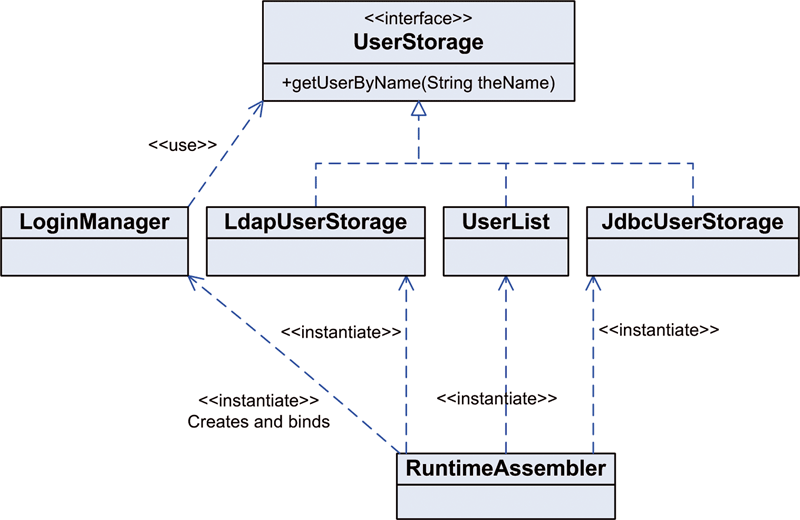 Итак, мы имеем прекрасные переносимые компоненты LoginManager, UserList, JdbcUserStorage, LdapUserStorage. Не стоит думать, что мы избавились от необходимости соединять их вместе. Для использования этих компонентов необходим некий класс RuntimeAssembler, который будет делать грязную работу по соединению компонентов в единую систему.