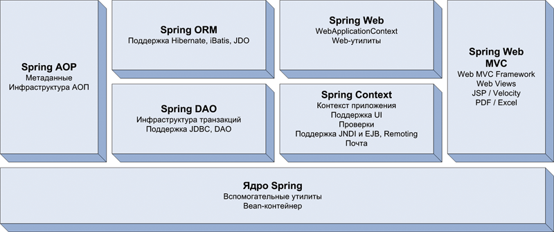 Spring также содержит прекрасные классы, реализующие паттерн MVC (модель-вид-контроллер) для Web-приложений. Абстрактные DAO-классы упрощают работу с persistance layer, будь то JDBC, JDO или Hibernate, и позволяют избежать больших трудностей при смене технологии. Транзакции реализуются собственным Transaction API, который позволяет использовать различные менеджеры транзакций, в том числе JTA J2EE-сервера приложений и Hibernate. Не стоит думать, что Spring является просто IoC-контейнером, он также предоставляет фундаментальную библиотеку для использования известных Java-технологий
