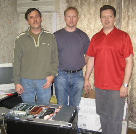 Не так много времени прошло с тех пор, как мы собрали сервер, который уже можно назвать старым. Это была замечательная четырехядерная машина (2х2) аж с восемью гигабайтами памяти и навороченной дисковой подсистемой из дорогущих SCSI-пятнадцатитысячников (tm). В момент, когда этот сервер поступил на службу, количество посетителей сайта обычно не превышало 10 тысяч человек в день. Однако с наступлением осени (и благодаря росту производительности сервера) количество посетителей достигло 15 тысяч в день. Производительности сервера опять стало не хватать. Поскребя по сусекам (с), мы решили собрать новый, еще более высокопроизводительный сервер, и запихнуть его во вдвое меньший корпус. Тайваньские процессор и память привез из Североамериканских Соединенных Штатов известный своими экспериментами бывший советский, а ныне американский ученый Игорь Ткачев (IT, в красном). Работой отверткой, поднятием и транспортировкой тяжести занимался Владислав Чистяков (VladD2, в центре). Моральной поддержкой и общим руководством занимался Михаил Купаев.
