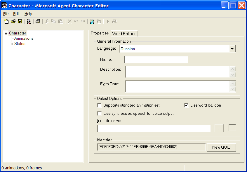 Выбираем из меню File пункт New. Предлагается три варианта — создание собственного персонажа, создание персонажа по умолчанию и создание помощника для MS Office. Основное их различие состоит в том, что при выборе персонажа по умолчанию или помощника для MS Office редактор самостоятельно создаст список необходимых анимаций для персонажа. В этот список можно добавлять новые анимации, расширяя возможности создаваемого агента. Обратите внимание на раскрывающий список Language в рамке General Information в правой части главного окна. Если персонаж должен поддерживать несколько языков, воспользуйтесь этим списком - выберите нужный язык и заполните остальные текстовые поля на выбранном языке. На практике, скорее всего, вам понадобятся два языка – английский (по умолчанию) и русский. Теперь надо определиться с именем персонажа. Отнеситесь к выбору имени серьезно. Постарайтесь, чтобы новое имя, во избежание путаницы, не повторяло уже существующие имена известных персонажей. Название не должно быть слишком сложным и длинным (не более 32 символов). Введите придуманное вами имя в текстовое поле Name. Например, для английской версии персонаж будет иметь имя Kitten, а на русском языке персонаж будет проходить под именем Котенок - ведь русскому пользователю будет гораздо комфортнее читать надписи на русском языке. К слову сказать, все персонажи от Microsoft в русских версиях Windows имеют русские имена.