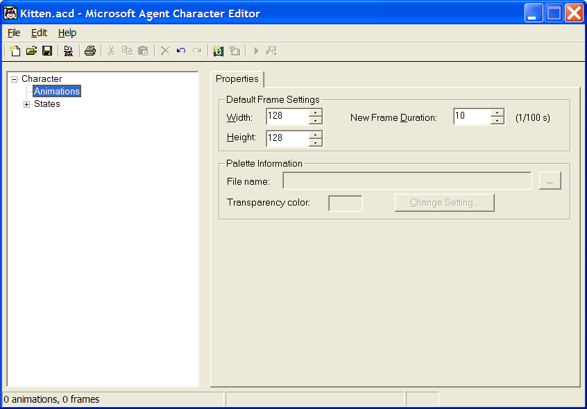 После того, как мы закончили с основными настройками персонажа, можно приступать к набору анимаций. Прежде чем приступать к созданию анимаций, нужно настроить основные параметры. Щелкните на ветви Animations иерархического списка, расположенного в левой части окна Microsoft Agent Character Editor (см. рис. 2). В правой части редактора появится дополнительное окно свойств, в котором можно изменить размеры и длительность воспроизведения кадров, а также назначить цветовую палитру.
