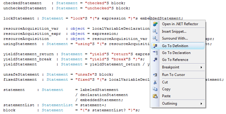 Кроме того PegGrammar генерирует довольно неплохой (с точки зрения производительности) код, состоящий в основном из if и присвоения одной целочисленной переменной (позиции парсинга). В генерируемом коде нет замыканий, классов и прочих высокоуровневых штуковин. А релиз-версии вместо структурных условных операторов используются goto. Все это положительно влияет на производительность парсера.
