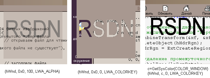 hWnd – это хэндл окна, для которого хотим применить эту функцию. crKey – цвет, который мы хотим сделать прозрачным. bAlpha – степень прозрачности окна. При bAlpha, равном нулю, окно делается полностью прозрачным. При bAlpha, равном 255 (0xff), окно становится совершенно непрозрачным. dwFlags может принимать два значения – LWA_COLORKEY и LWA_ALPHA, которые могут использоваться совместно при помощи операции «логического ИЛИ». В случае, если используется значение LWA_COLORKEY, то всё окно делается абсолютно прозрачным, а прозрачность цвета, совпадающего с указанным в crKey, определяется параметром bAlpha. Например, если указать