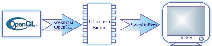 где Off-screen Buffer может являться как DIB-секцией (DIB-section, см. ниже), так и аппаратно реализованной частью графического ускорителя. Однако вы не сможете получить прямой доступ к этому буферу, а можете только вывести его функцией SwapBuffers в соответствующую часть окна. Инициализация подобного приложения заканчивается созданием OpenGL контекста HGLRC.