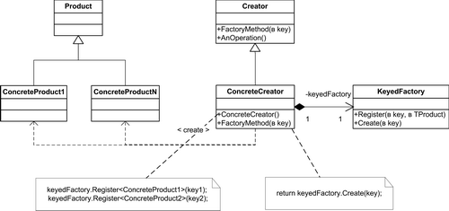 Среди различных реализаций данного паттерна выделяют параметризованные фабричные методы ([1], стр. 115). В фабричный метод передается ключ, на основании которого конкретный создатель решает, какой именно конкретный продукт создать и вернуть. Большой набор значений ключа часто приводит к загроможденному коду и, как следствие, к трудностям сопровождения приложения. Данную проблему можно устранить при помощи обобщений (generics) и анонимных методов (anonymous methods) языка C# 2.0. Для этого предлагается ввести дополнительный класс KeyedFactory, на который возлагается выбор метода создания объекта и его вызов. Конкретный создатель при инициализации регистрирует в KeyedFactory пары <значение, делегат создания> и непосредственно в фабричном методе делегирует создание объекта KeyedFactory. По сути своей KeyedFactory является словарем <ключ, фабричный метод>. Модифицированная структура шаблона Factory Method приведена на рисунке 2.