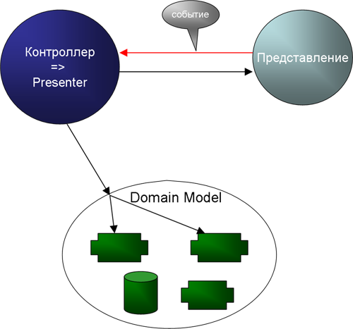 При этом еще в описании оригинального паттерна упоминалось, что выделение отдельного Контроллера не так важно как отделение Представления от Модели и Контроллер вполне может быть интегрирован в Представление, тем более что в классическом варианте MVC логики в Контроллере не очень много, впрочем к этому мы еще вернемся...