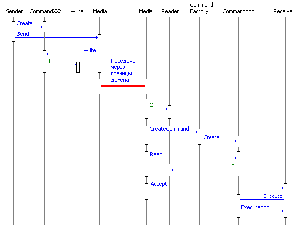 Для сериализации используем метод Write, с помощью которого конкретная команда будет посылать свои данные в поток, задаваемый интерфейсом IWriter. Для десериализации в интерфейсе команды определен метод Read, с помощью которого конкретная команда получает свои данные из потока IReader в процессе конструирования команды у получателя.