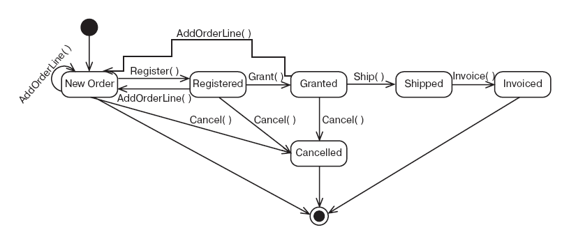 Следует также иметь в виду, что определенное поведение приводит к смене состояния. Так, если вызывается метод AddOrderLine(), происходит смена состояния Granted обратно на New Order.